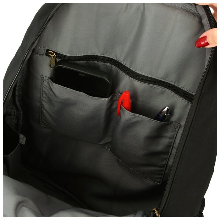 ・両サイドに、ペットボトルや折りたたみ傘が入るオープンポケットを1つずつ配置。拡張可能なバックルベルト付きで、荷物がこぼれ落ちる心配がなく安心。