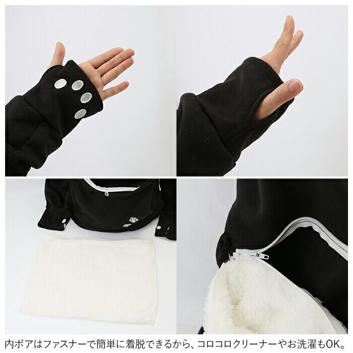 ・フロントに愛猫を入れられるポケットを装備!ポケット内はフカフカしたボア素材で、ネコちゃんもぬくぬく心地良い◎