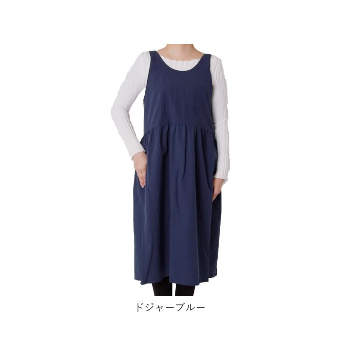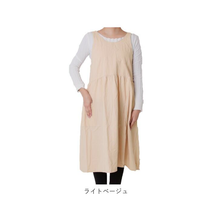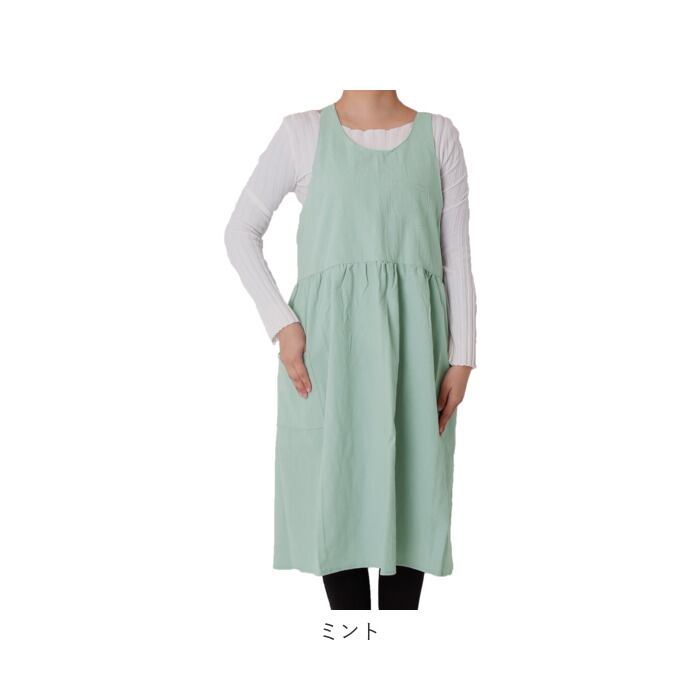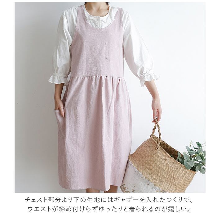 ・チェスト部分より下の生地にはギャザーを入れたつくりで、ウエストが締め付けらずゆったりと着られるのが嬉しい。キッチンでお料理をする時やお掃除をする時にも動きやすく、ほっと一息つきたい時やリラックスタイムにもオススメなほっこりエプロン♪