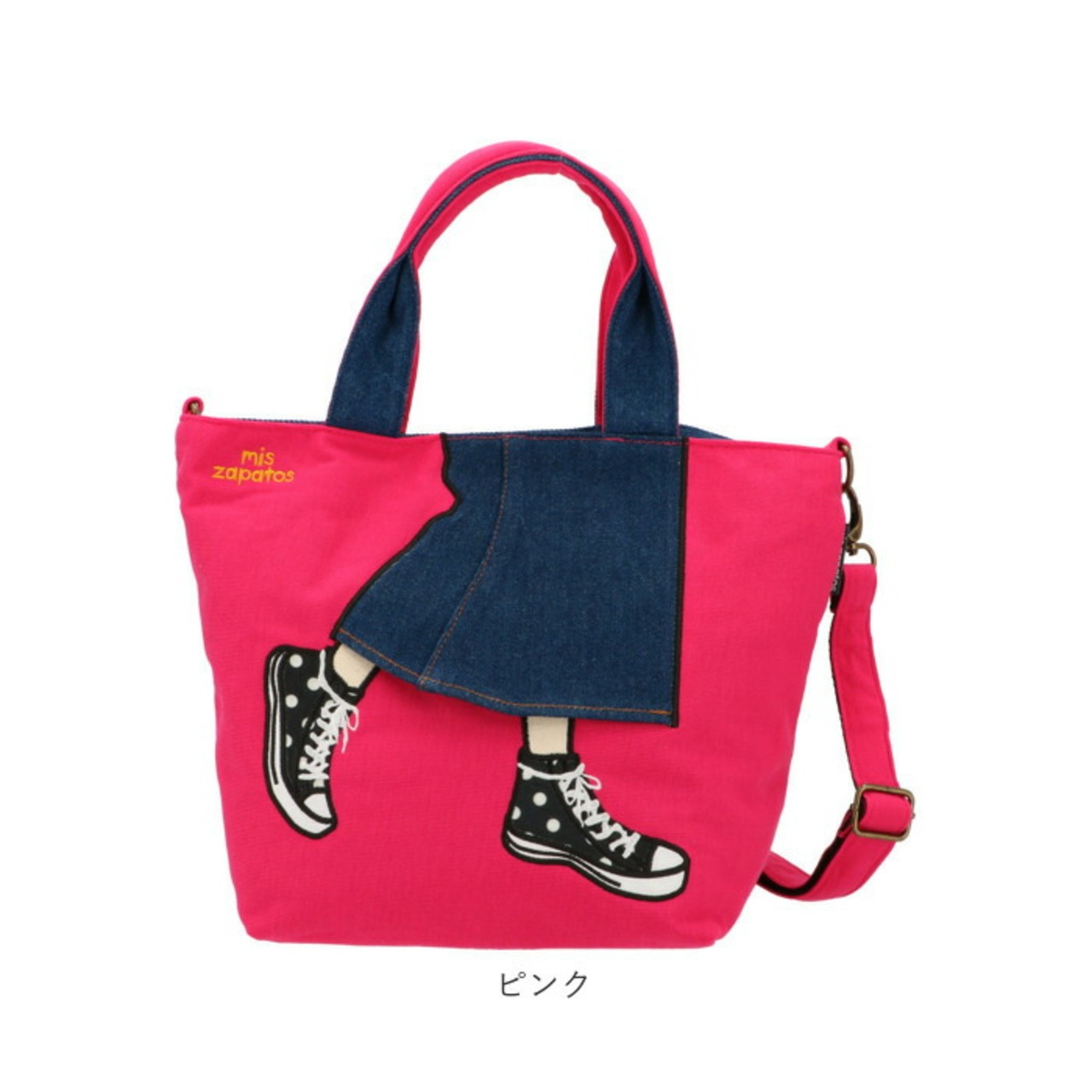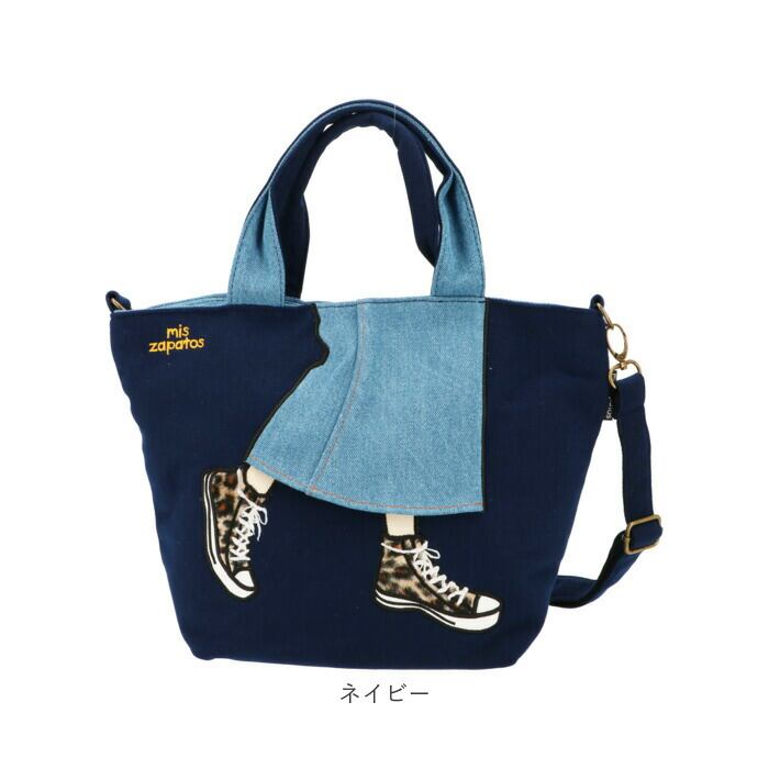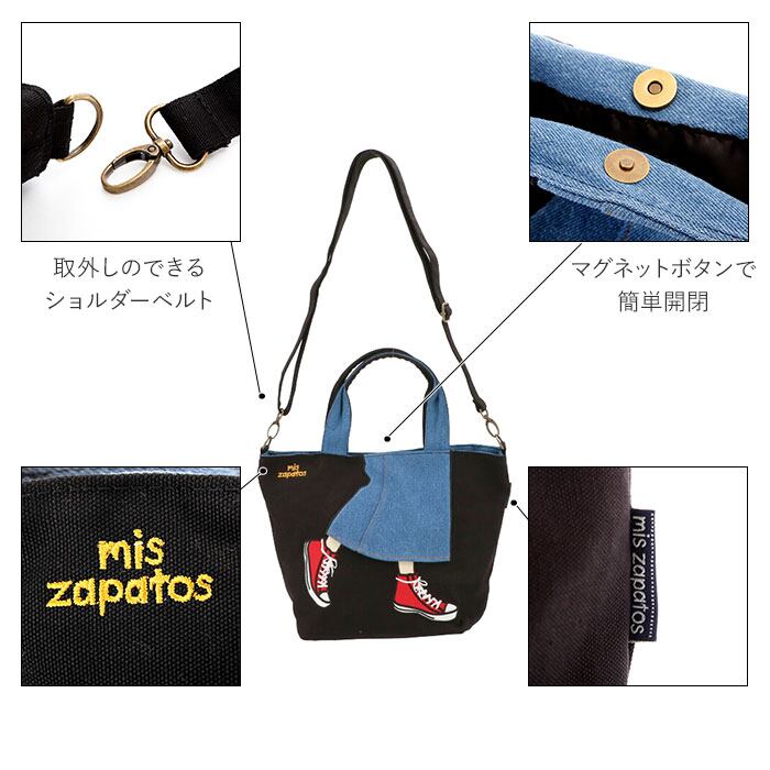 ・編み上げスニーカーやデニムスカートのフチ、mis zapatosのロゴに施された立体的な刺繍がとっても個性的!自分だけの個性的なバッグに。