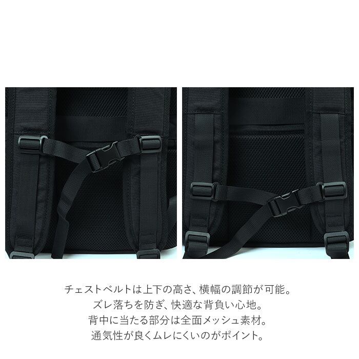 ・チェストベルトは上下の高さ、横幅の調節が可能。ズレ落ちを防ぎ、快適な背負い心地。