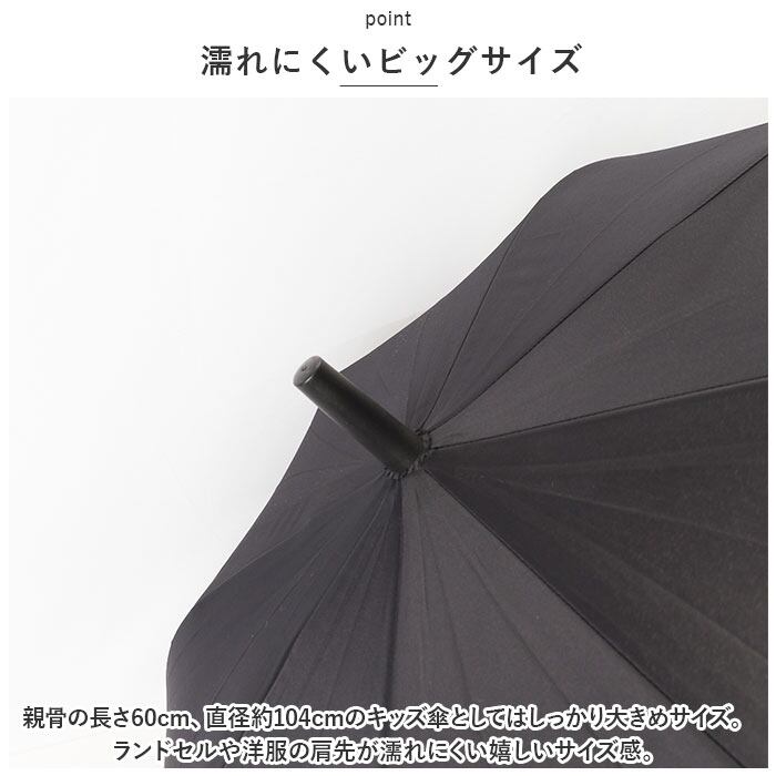 ・親骨の長さ60cm、直径約104cmのキッズ傘としてはしっかり大きめサイズ。ランドセルや洋服の肩先が濡れにくい嬉しいサイズ感。