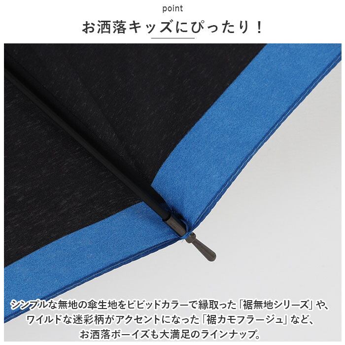 ・シンプルな無地の傘生地をビビッドカラーで縁取った「裾無地シリーズ」や、ワイルドな迷彩柄がアクセントになった「裾カモフラージュ」など、お洒落ボーイズも大満足のラインナップ。