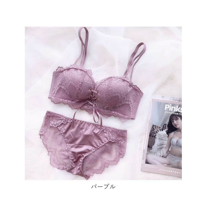 ・ノンワイヤーなのに谷間をメイク♪脇高設計×編み上げスタイルで美乳をつくるブラジャーと、お揃いのショーツのセットが新登場♪