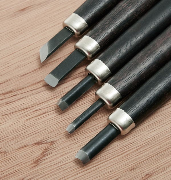 平刀、切出刃、三角刃、中丸刃、小丸刃の5種類の彫刻刀がセットになっています。