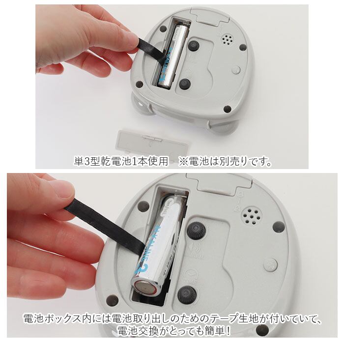 ・単3型乾電池1本使用。電池ボックス内には電池取り出しのためのテープ生地が付いていて、電池交換がとっても簡単!(※電池は別売りです。)