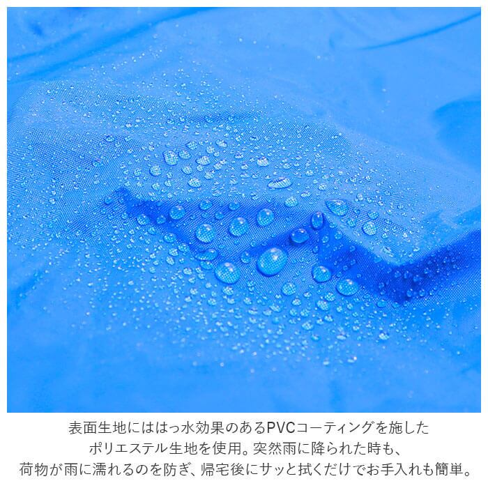 ・表面生地にははっ水効果のあるPVCコーティングを施したポリエステル生地を使用。突然雨に降られた時も、荷物が雨に濡れるのを防ぎ、帰宅後にサッと拭くだけでお手入れも簡単。