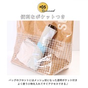 ・バッグのフロントにはメッシュ状になった透明ポケット付き。タオルやハンカチ、折りたたみ傘など、小物類がちょこんと気軽に収納できる!