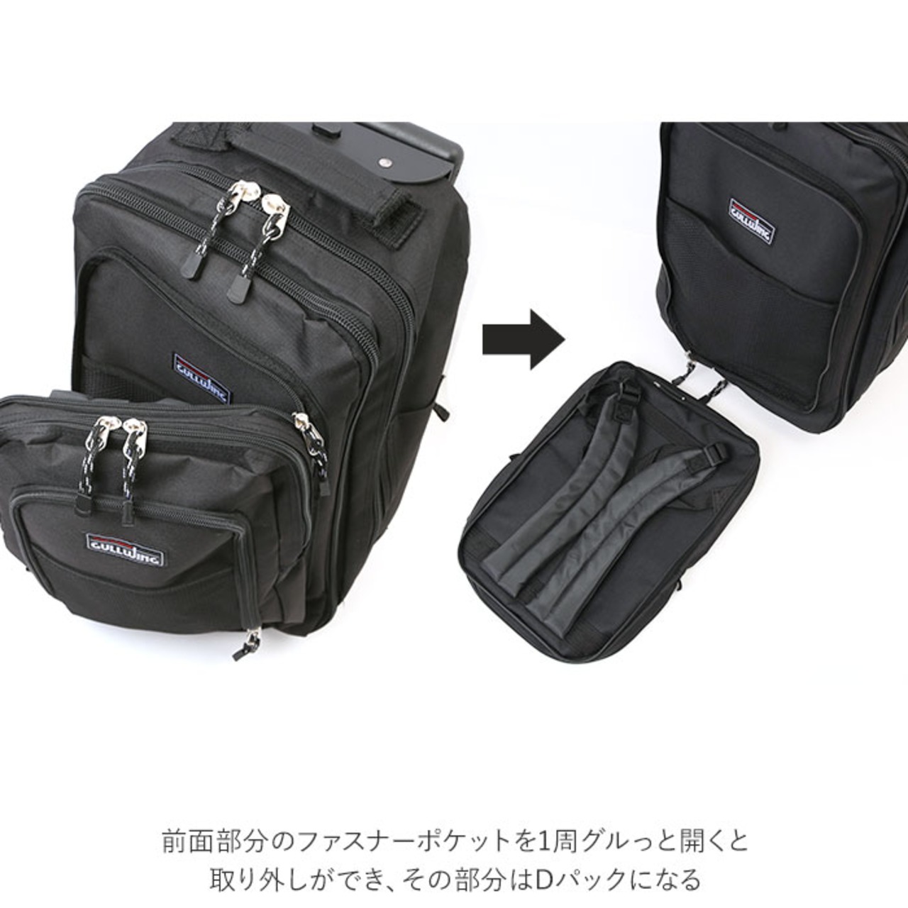 ・前面部分のファスナーポケットを1周グルっと開くと取り外しができ、その部分はDパックになる。