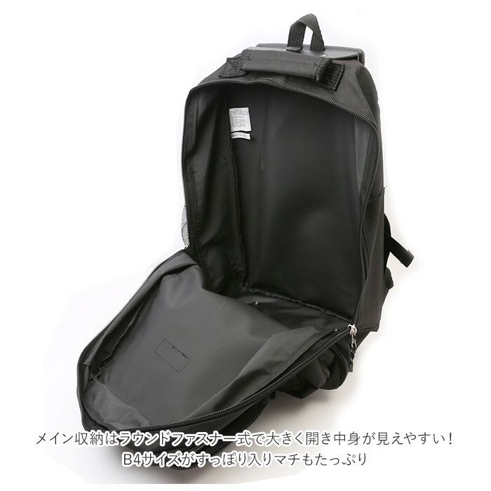 ・メイン収納はラウンドファスナー式で大きく開き中身が見えやすい!B4サイズがすっぽり入りマチもたっぷり。さらに前面のファスナーを開くと幅が広がり、荷物がたくさん入れられる。
