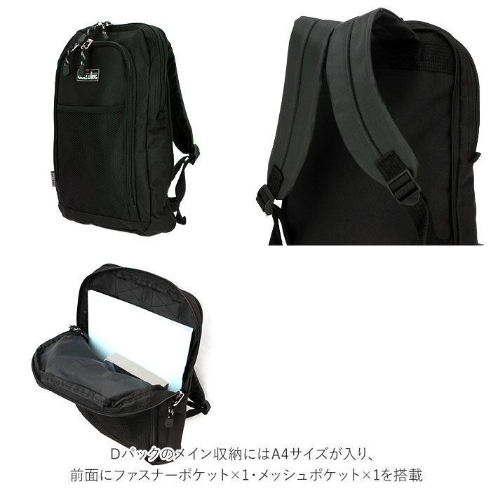 ・Dパックのメイン収納にはA4サイズが入り、前面にファスナーポケット×1・メッシュポケット×1を搭載。