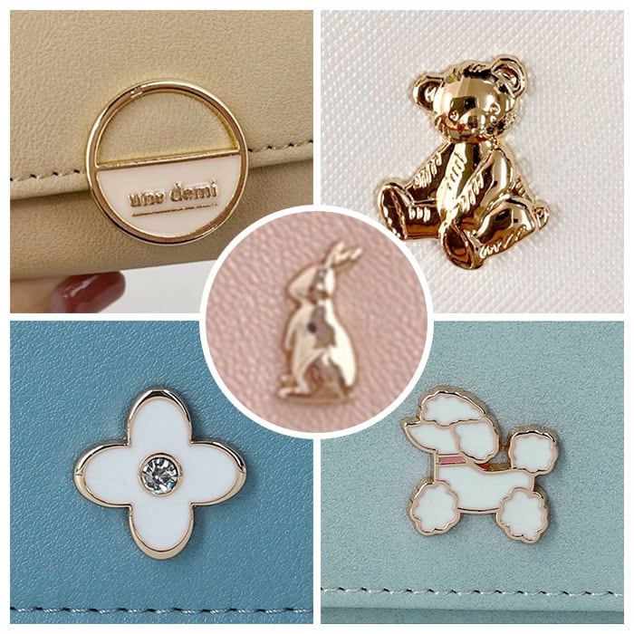 ・柔らかな質感のフェイクレザーに、エレガントなモチーフを控え目に配置。ちょこんと座ったゴールドのテディベアが可愛い「くま」、ぷっくりとしたエポキシ樹脂加工が印象的な「プードルエポ」「お花エポ」など、バラエティに富んだモチーフデザインが魅力。