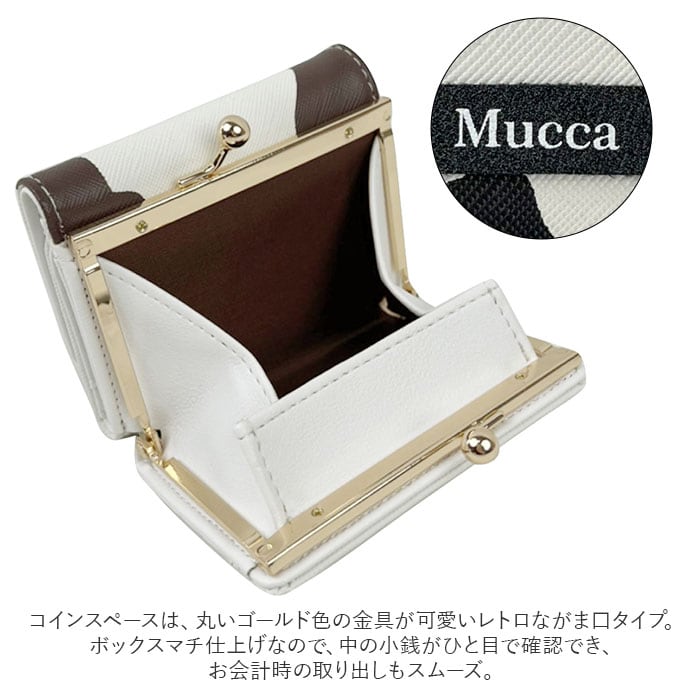 ・コインスペースは、丸いゴールド色の金具が可愛いレトロながま口タイプ。ボックスマチ仕上げなので、中の小銭がひと目で確認でき、お会計時の取り出しもスムーズ。