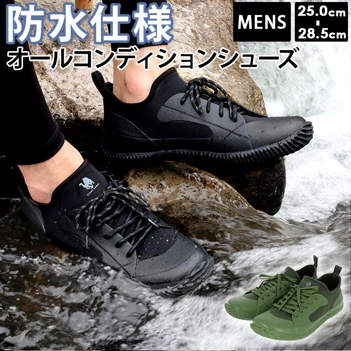 シューズ 釣り 通販 レインシューズ スニーカー 防水 メンズ クッション 柔らかい カップインソール キャンプ アウトドア フィッシング レジャー キャンピング ガーデニング ブラック カーキ
