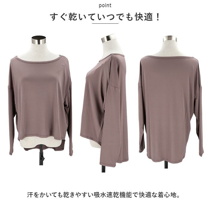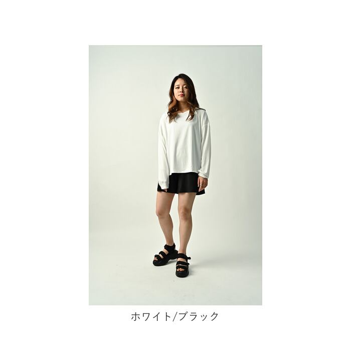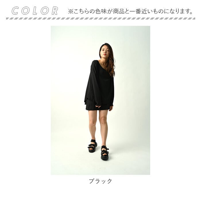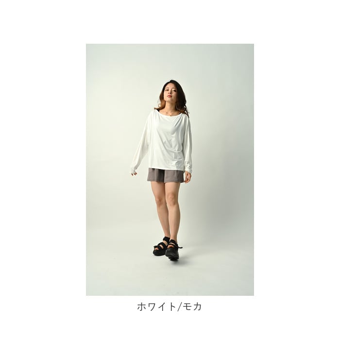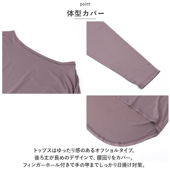・トップスはゆったり感のあるオフショルタイプ。後ろ丈が長めのデザインで、腰回りをカバー。フィンガーホール付きで手の甲までしっかり日焼け対策。