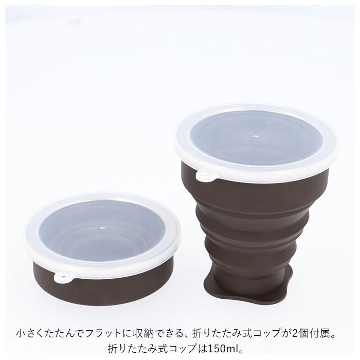 ・小さくたたんでフラットに収納できる、折りたたみ式コップが2個付属。キャンプやBBQなどでコーヒーをシェアする時にピッタリ。