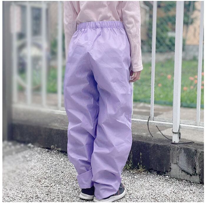 ・ウエストゴム式のレインパンツは脱ぎ着がラクに出来て、通学用ズボンの上から履いてもつっぱらない余裕のあるつくり。