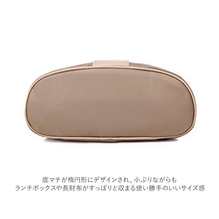 ・底マチが楕円形にデザインされ、小ぶりながらもランチボックスや長財布がすっぽりと収まる使い勝手のいいサイズ感。