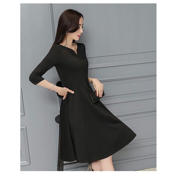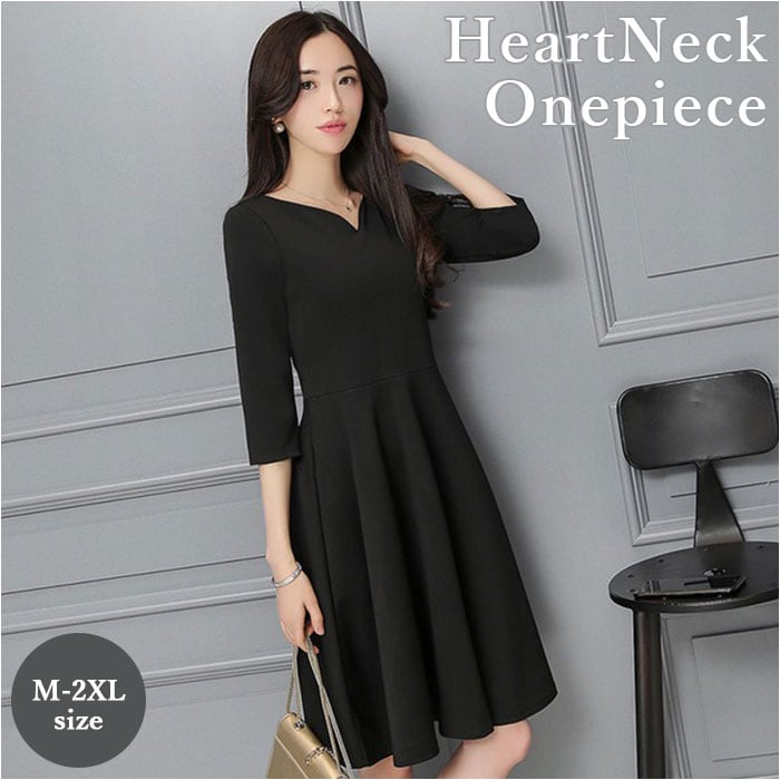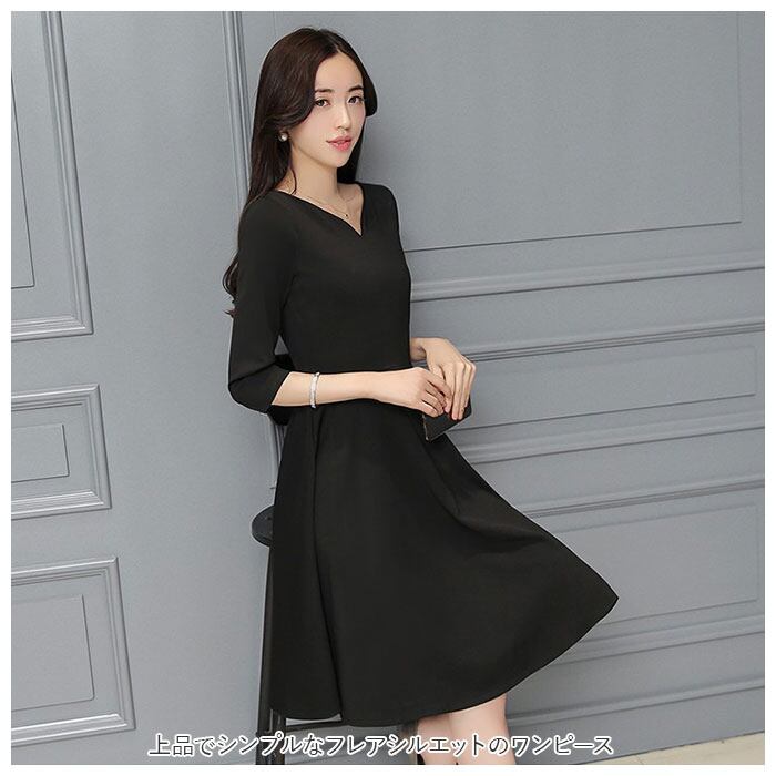 ワンピース きれいめ レディース 通販 Vネック 七分袖 7分袖 ブラック 黒 ミディアム パーティ パーティー フォーマル 礼服 ノーカラー 結婚式 2次会 二次会 お呼ばれ 演奏会 発表会 フレアワンピース Aラインワンピース フレア Aライン ひざ下丈 フォーマル