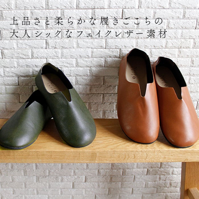・つま先のまぁるいフォルムとフェイクレザーの柔らかな質感が足に優しく馴染む、リラックス感のある携帯シューズ。
