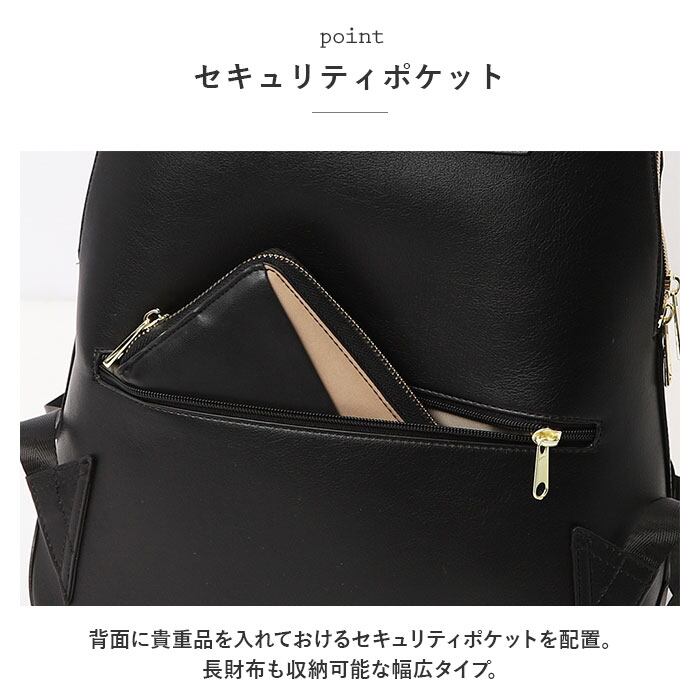 ・背面に貴重品を入れておけるセキュリティポケットを配置。長財布も収納可能な幅広タイプ。