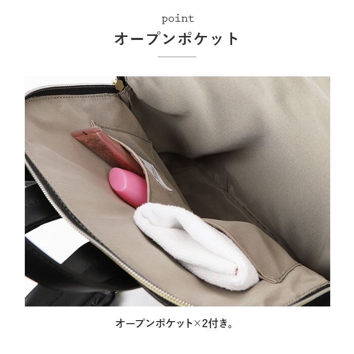 ・内側はA4サイズがすっぽり。ミニポーチや500mlペットボトルなど、お出かけに必要な小物がすっきりと収まるサイズ感。オープンポケット×2付き。