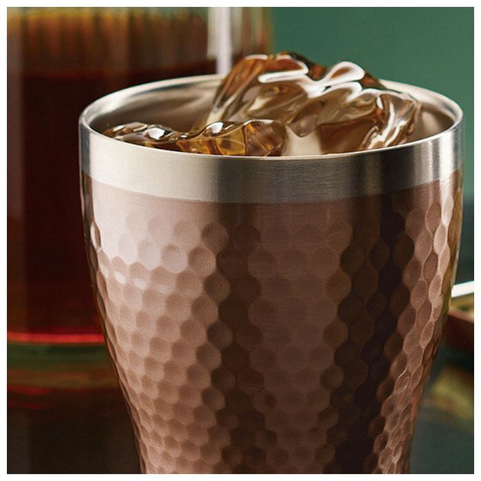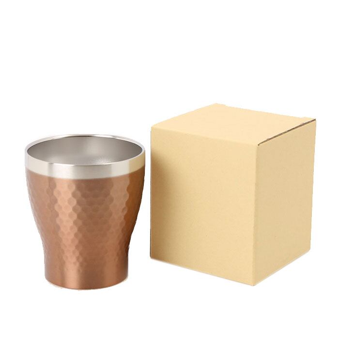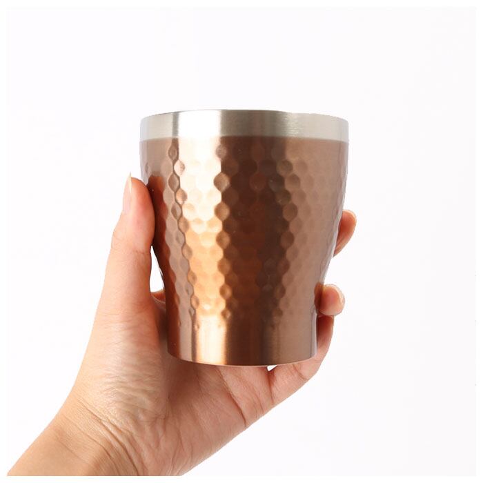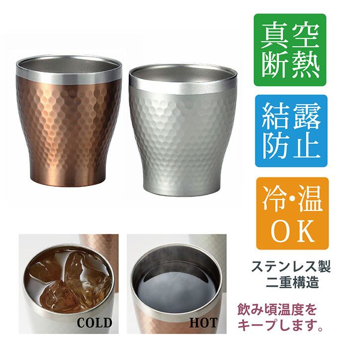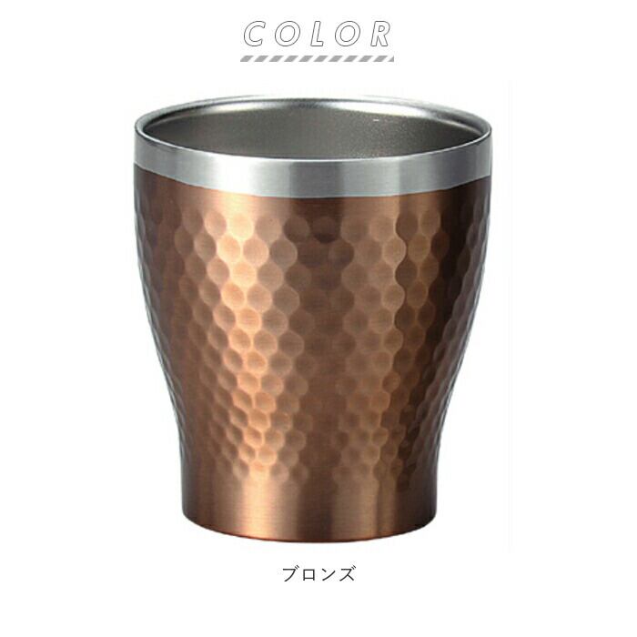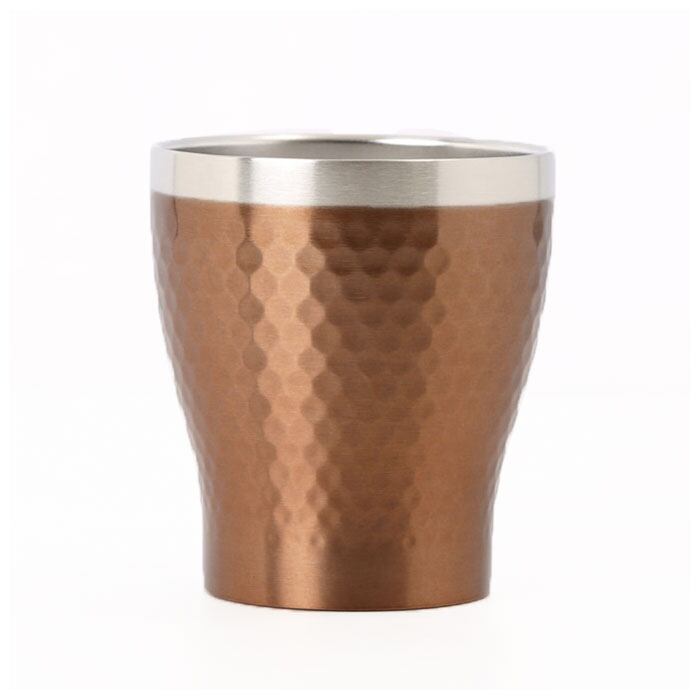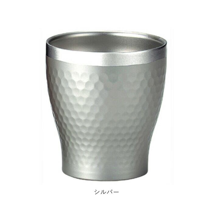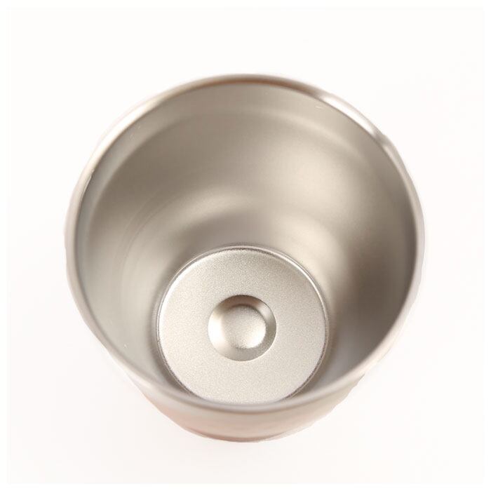 ・表面は高級感のある打ち出し加工仕上げ。ツヤのあるメタリック調で、飲み口がシルバー色に縁取られたスタイリッシュなデザイン。