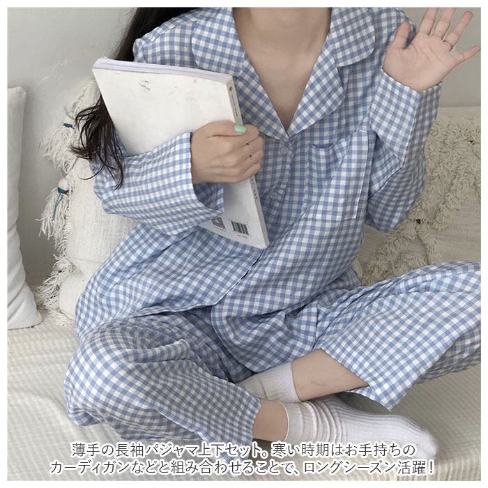 【廃盤】パジャマ レディース 上下セット セットアップ 通販 ルームウェア 長袖 長ズボン 上下 セット 前開き ズボン テーラー襟 チェック 格子 カジュアル かわいい 春 秋 婦人 おしゃれ
