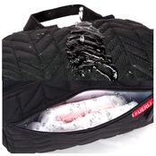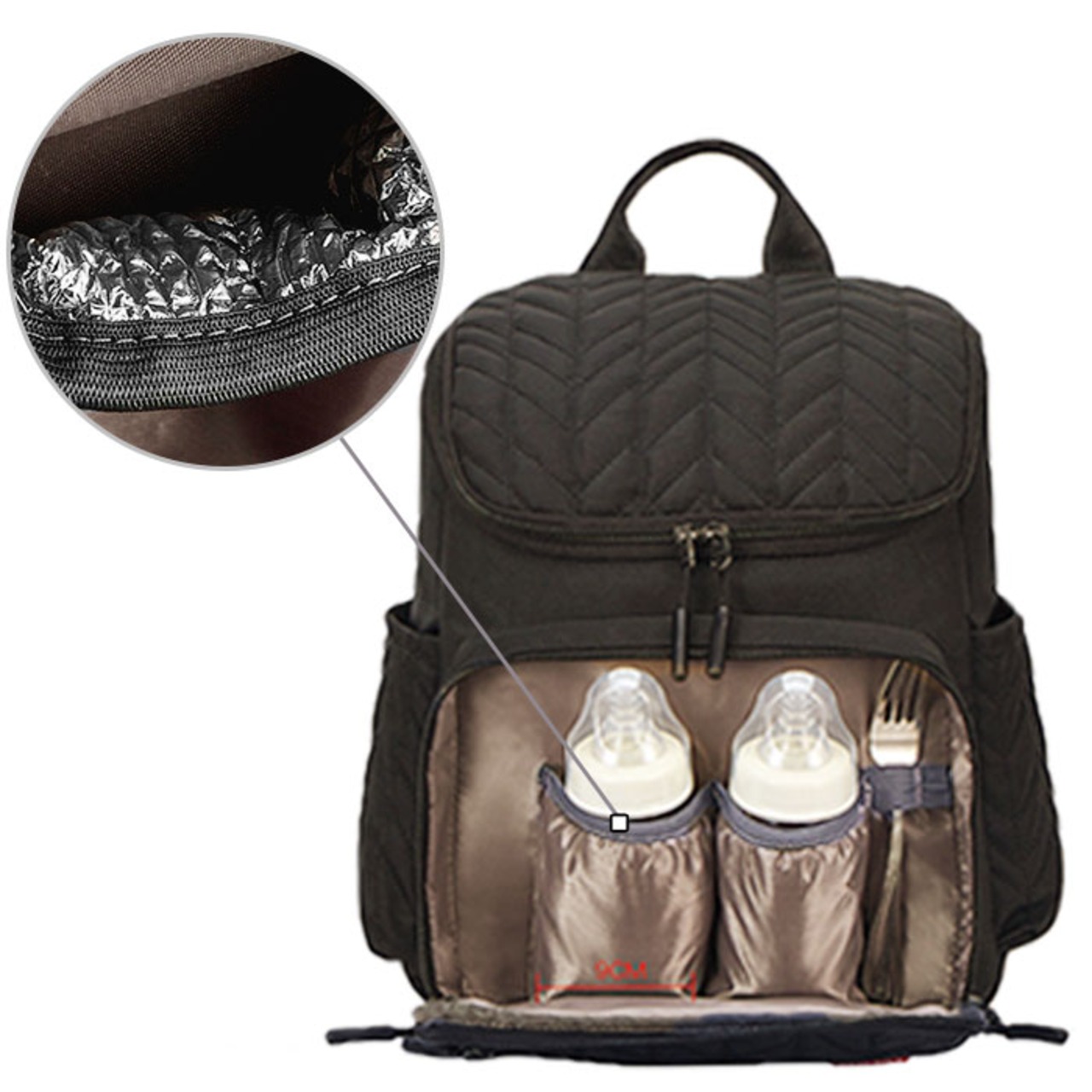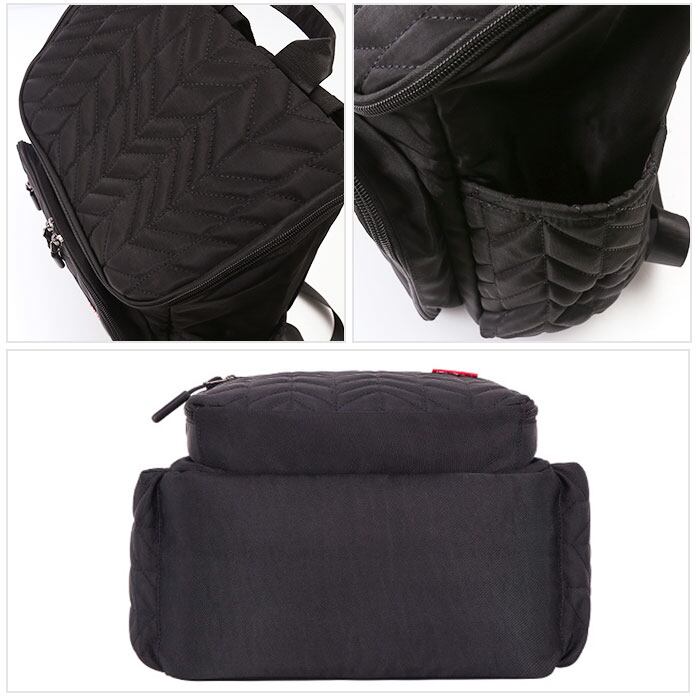 ・前面のラウンドファスナーポケットはダブルファスナー式でアルミシート付き!哺乳瓶が2本収納可能。