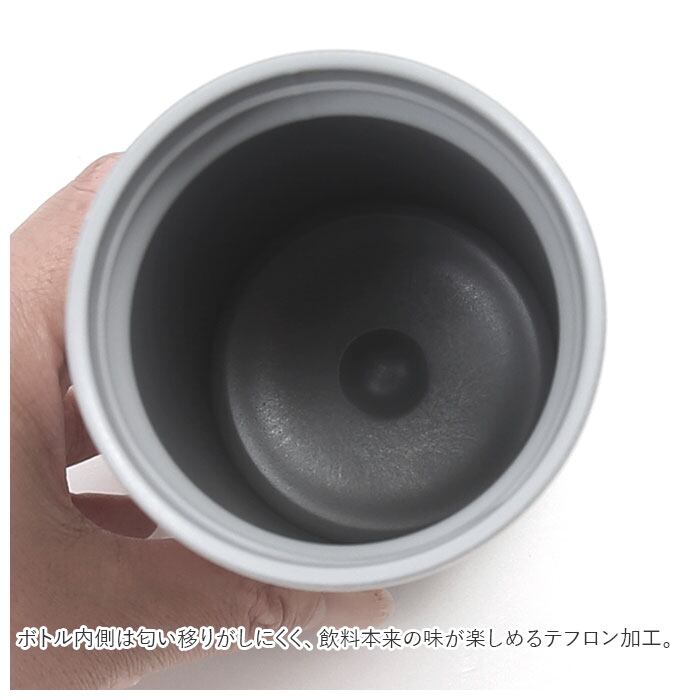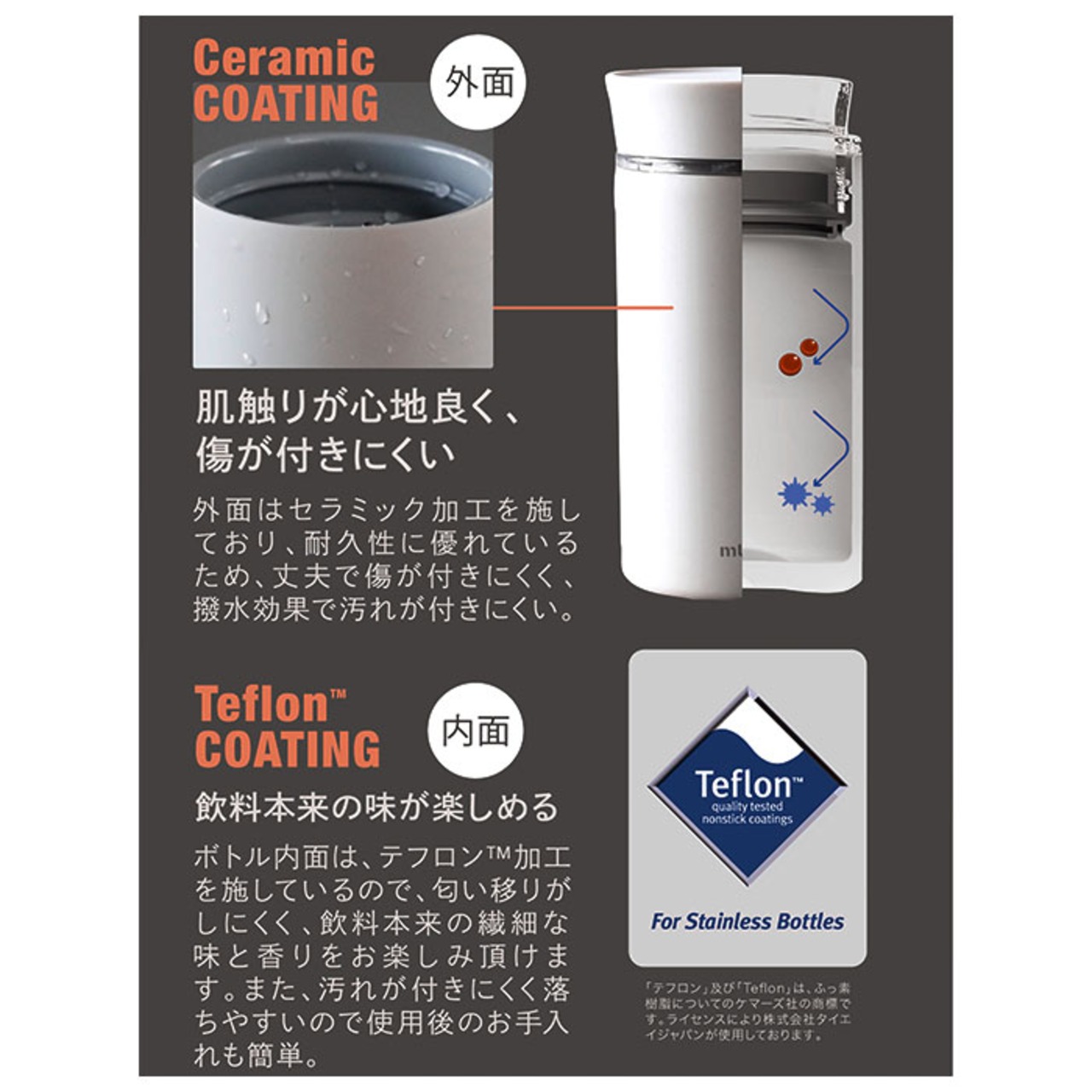 ・ボトル内側は匂い移りがしにくく、飲料本来の味が楽しめるテフロン加工。外側は耐久性に優れ、汚れを寄せ付けないセラミック加工を施した世界初のボトル構造。