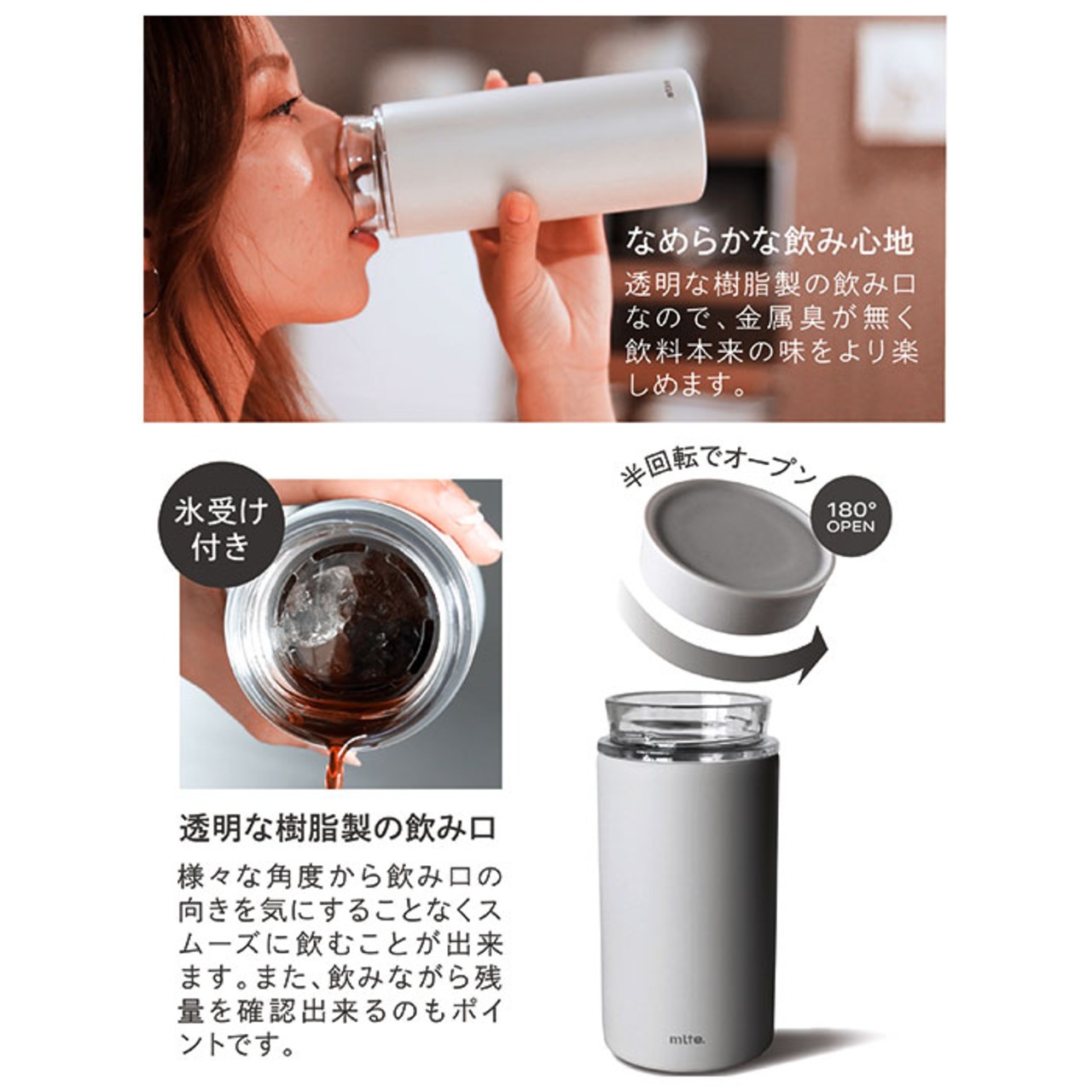 ・口当たり滑らかな透明樹脂製の飲み口には、冷たい飲み物がゴクゴク飲める「氷受け付き」!飲みながらドリンクの残量がひと目でわかるのも注目ポイント!