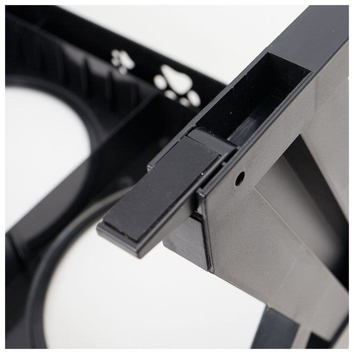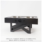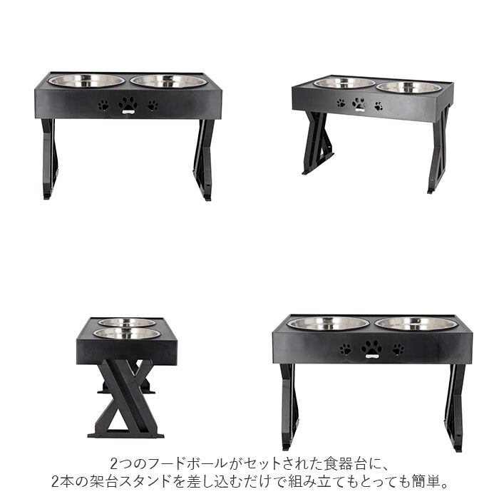 ・2つのフードボールがセットされた食器台に、2本の架台スタンドを差し込むだけで組み立てもとっても簡単。(※架台スタンドを縦向きに使用するときは食器台の左右、横向きに使用するときは前後にセットします。)