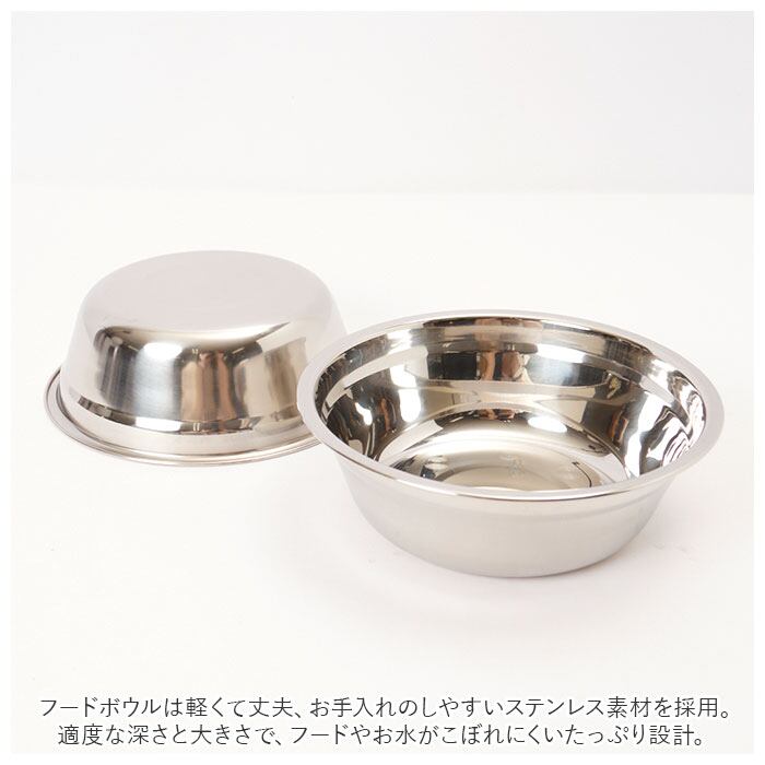 ・フードボウルは軽くて丈夫、お手入れのしやすいステンレス素材を採用。適度な深さと大きさで、フードやお水がこぼれにくいたっぷり設計。