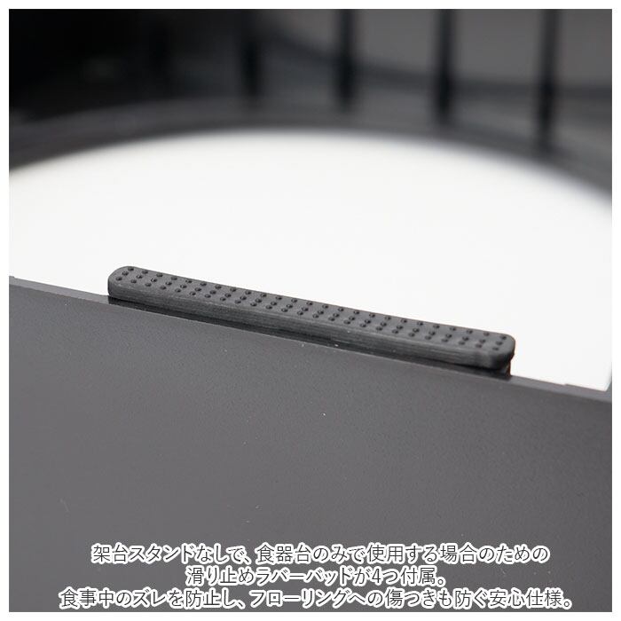 ・架台スタンドなしで、食器台のみで使用する場合のための滑り止めラバーバッドが4つ付属。食事中のズレを防止し、フローリングへの傷つきも防ぐ安心仕様。