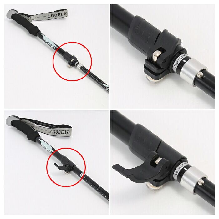 (4)第1段目と第2段目のポールの長さを調節する。お好みの長さになったら黒いレバーを下げ、レバー横の白いナットを閉め固定する。