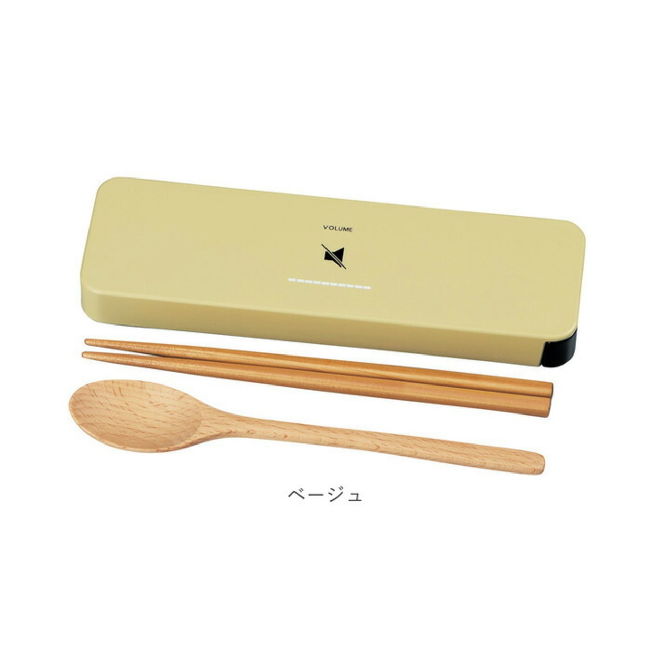 ・くすみカラーに音量表示のロゴがアクセント♪おしゃれなケースに入った「VOLUME スライド スプーン&箸セット 18cm」が登場。