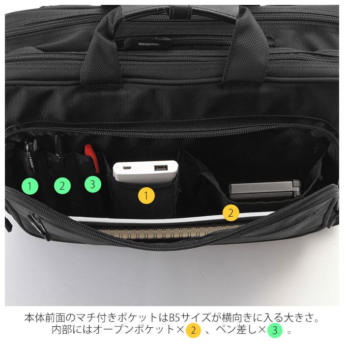 ・本体前面のマチ付きポケットはB5サイズが横向きに入る大きさ。内部にはオープンポケット×2、ペン差し×3。マチ付きポケット外側のファスナーポケットはB6サイズの書籍や長財布が横に入る大きさ。