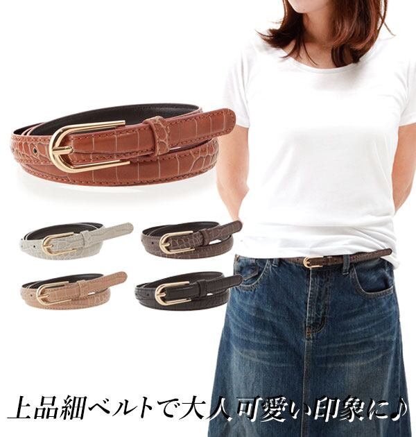 クロコダイルフェイクレザー細ベルトです。大人スタイルには欠かせない細めベルト♪定番でオールシーズン使えるので、コーデの強い味方になります。ファッションのアクセントや差し色に☆デニムなどに合わせてベルトループを通しても、ワンピやチュニックに合わせても可愛いですね♪