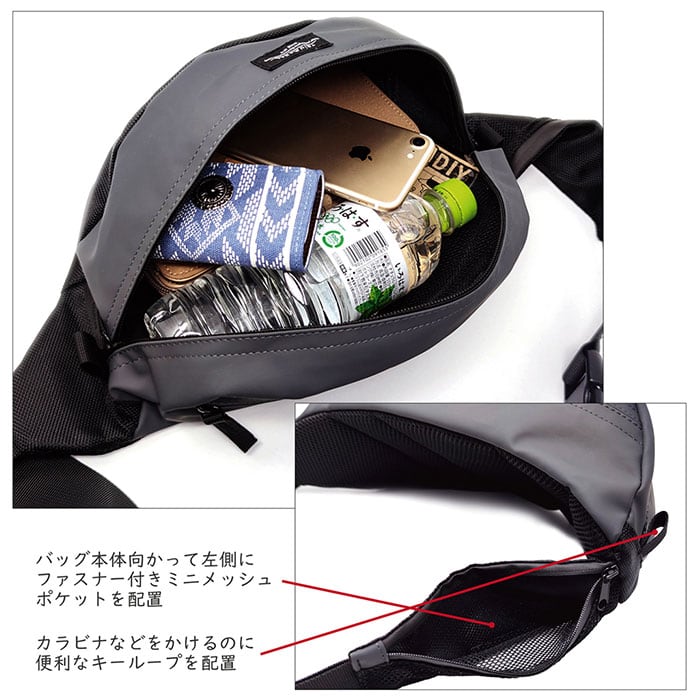・バッグ本体の左側はファスナー開閉式ミニメッシュポケット付き。背面は着用をサポートするパッド付きエアメッシュ構造を採用。