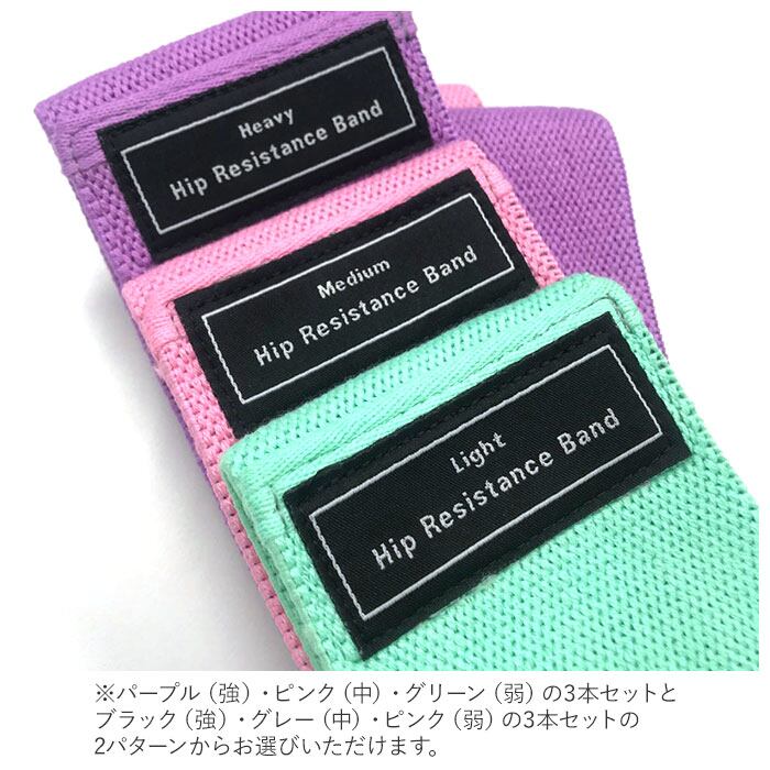 ・カラーごとにゴムの強度が違う3本セットなので鍛えたい場所や自分の負荷に合ったものが選べる。(※パープル(強)・ピンク(中)・グリーン(弱)の3本セットと、ブラック(強)・グレー(中)・ピンク(弱)の3本セットの2パターンからチョイスできる♪)