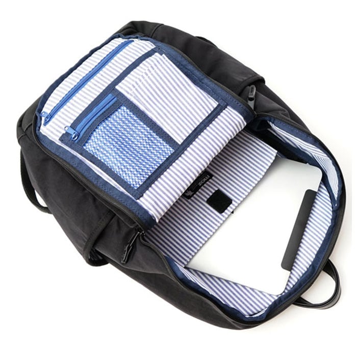 ・メイン収納スペース、開口部はコの字型にファスナーが大きく開いて、デイパック内部が見やすく、小物の出し入れがしやすい造り。A4サイズ対応。