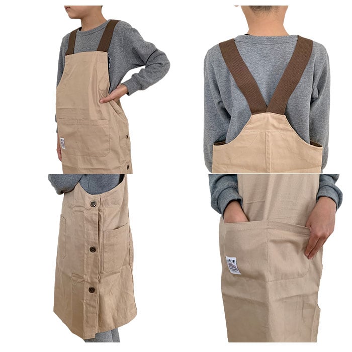 ・サイドボタン付きのカバーオールタイプなので、小さい子でも着やすく、ヒモがほどけたり、しゃがんで裾が地面に付く心配なし◎