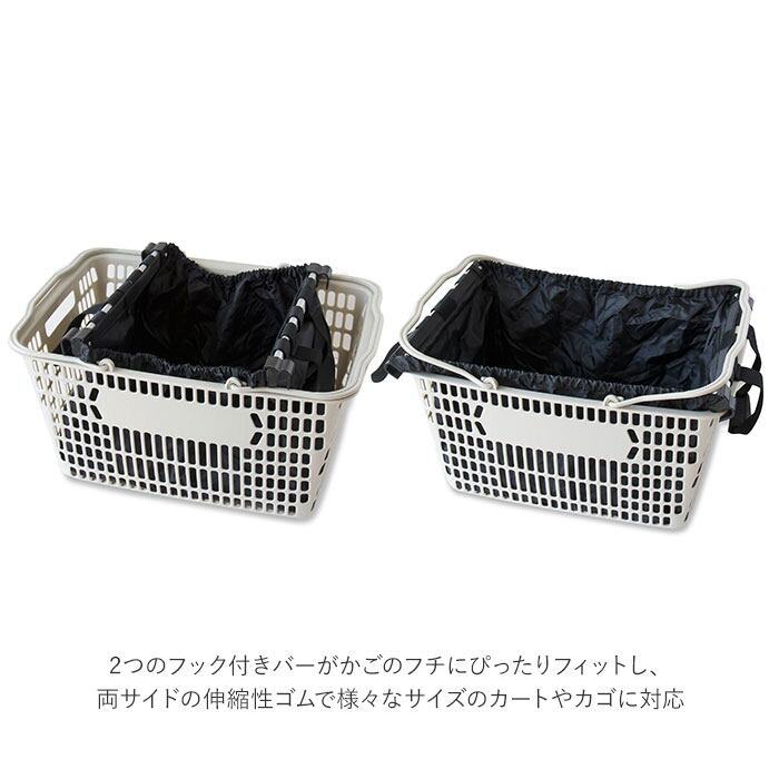 ・2つのフック付きバーがショッピングカートのフチにぴったりフィットし、両サイドの伸縮性ゴムで様々なサイズのカートやカゴに対応。