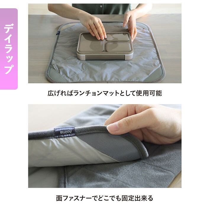 ・4隅にある面ファスナーが表生地のどこにでもくっつくので、丸型、四角、二段と様々な形のお弁当箱がラクラク包めちゃう!