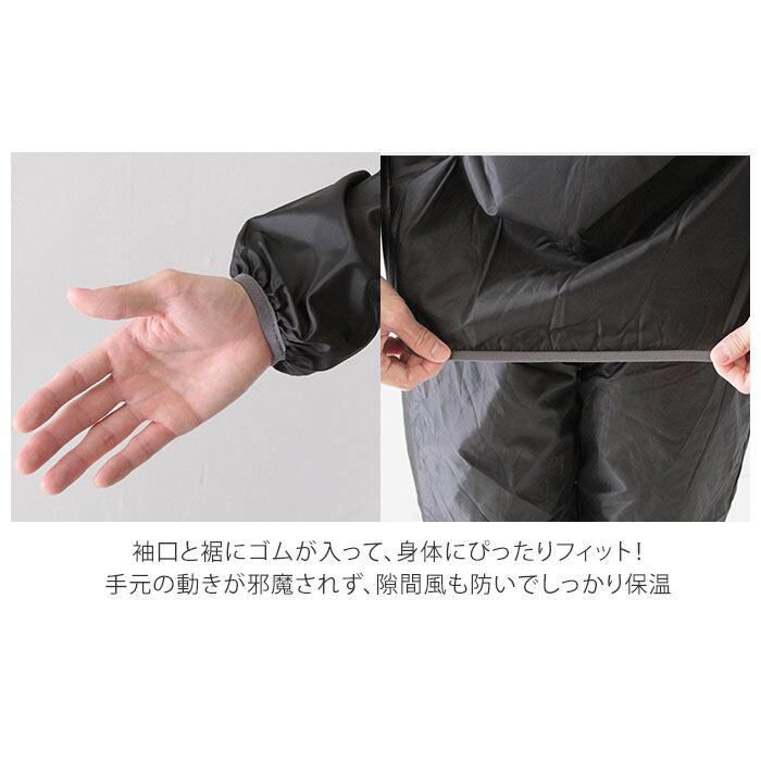 ・袖口と裾にゴムが入って、身体にぴったりフィット!手元の動きが邪魔されず、隙間風も防いでしっかり保温。