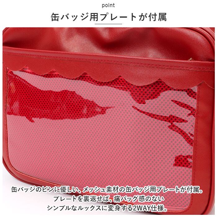 ・バッグ前面・・・クリア窓仕様ファスナーポケット×1(缶バッジ用プレートが付属)