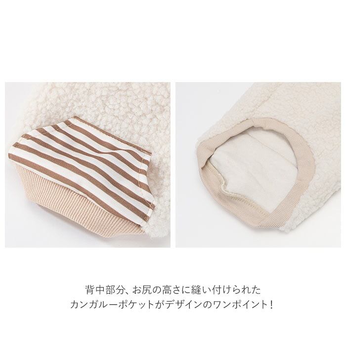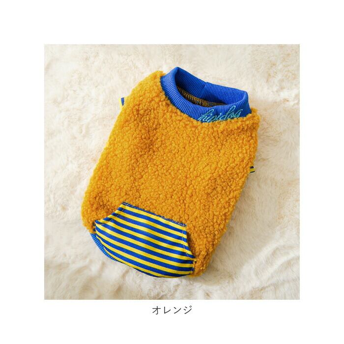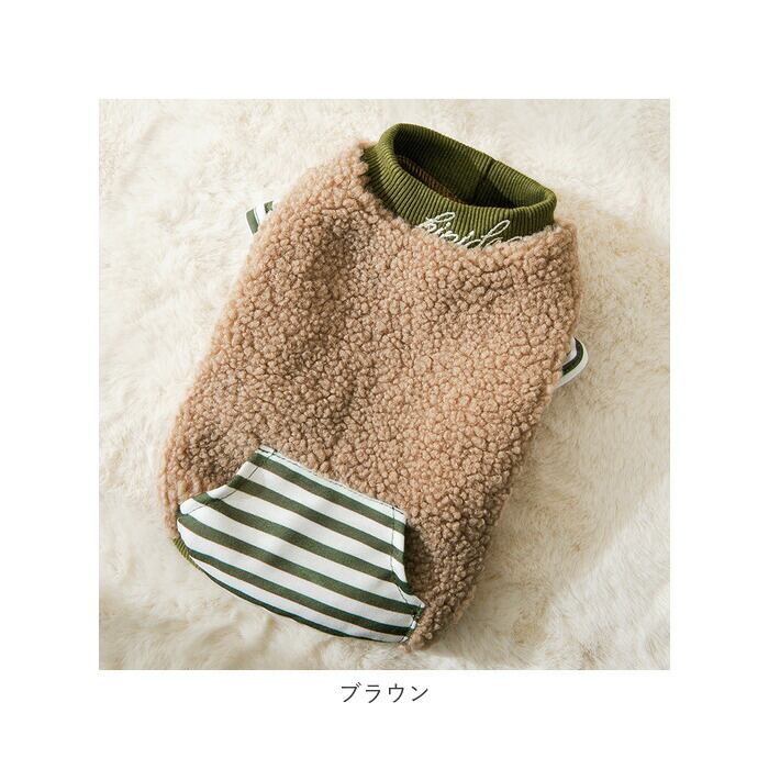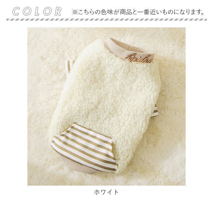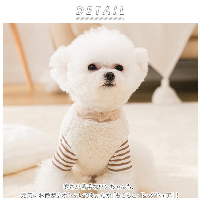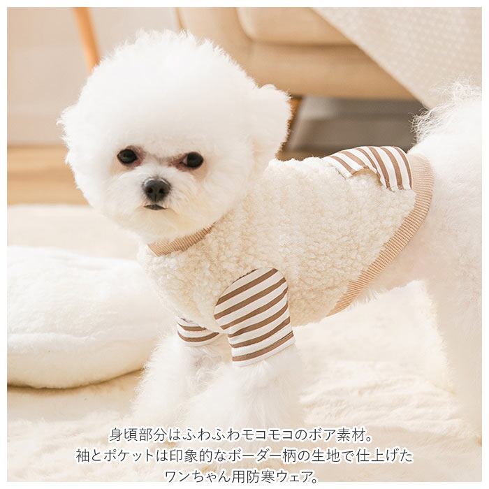 ・身頃部分はふわふわモコモコのボア素材。袖とポケットは印象的なボーダー柄の生地で仕上げたワンちゃん用防寒ウェア。