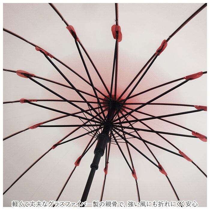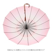 ・和傘のように風雅なシルエットが印象的な16本骨タイプ。軽くて丈夫なグラスファイバー製の親骨で、強い風にも折れにくく安心。