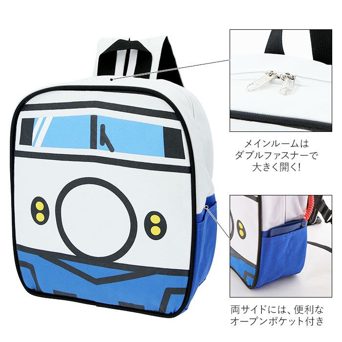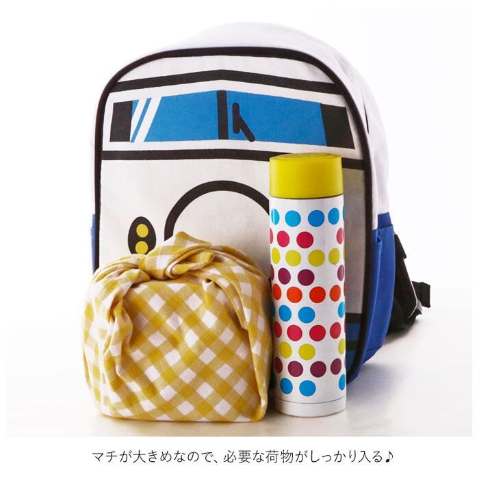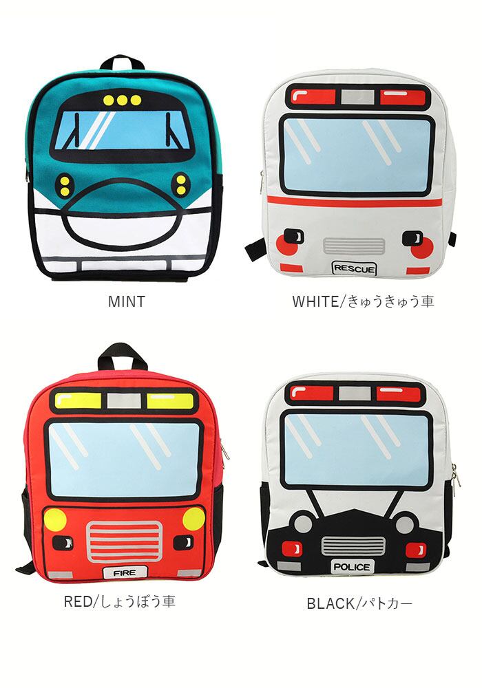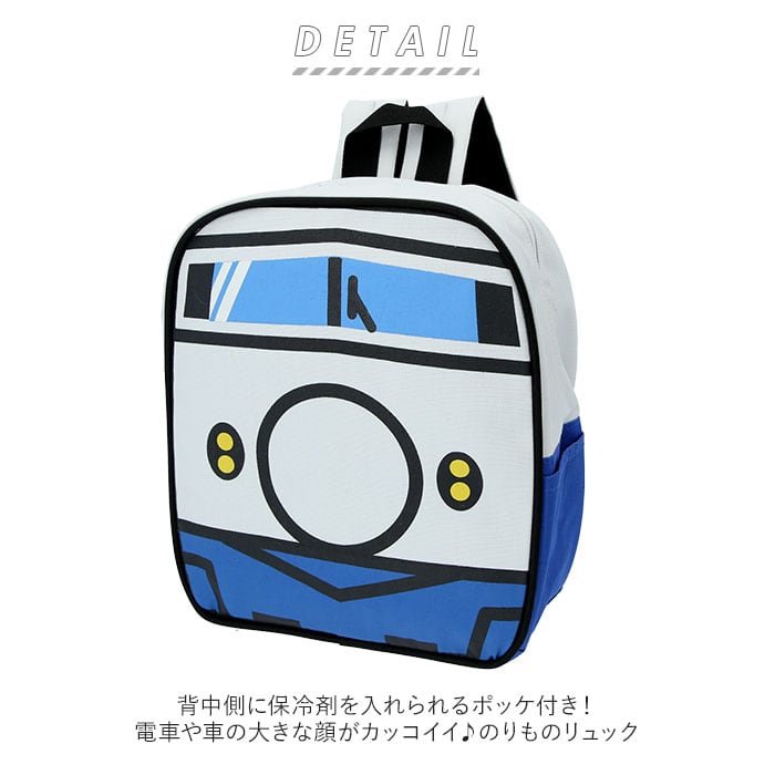 ・軽くて丈夫なキャンバス生地を使用。背中側に保冷剤を入れられるポッケ付き!電車や車の大きな顔がカッコイイ♪のりものリュック