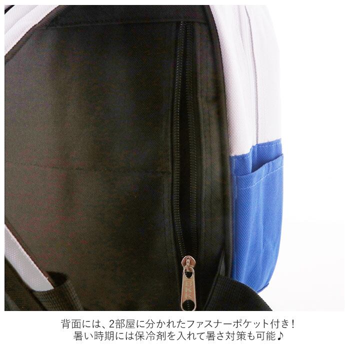 ・背面には、2部屋に分かれたファスナーポケット付き。暑い時期には保冷剤を入れて暑さ対策も可能。
